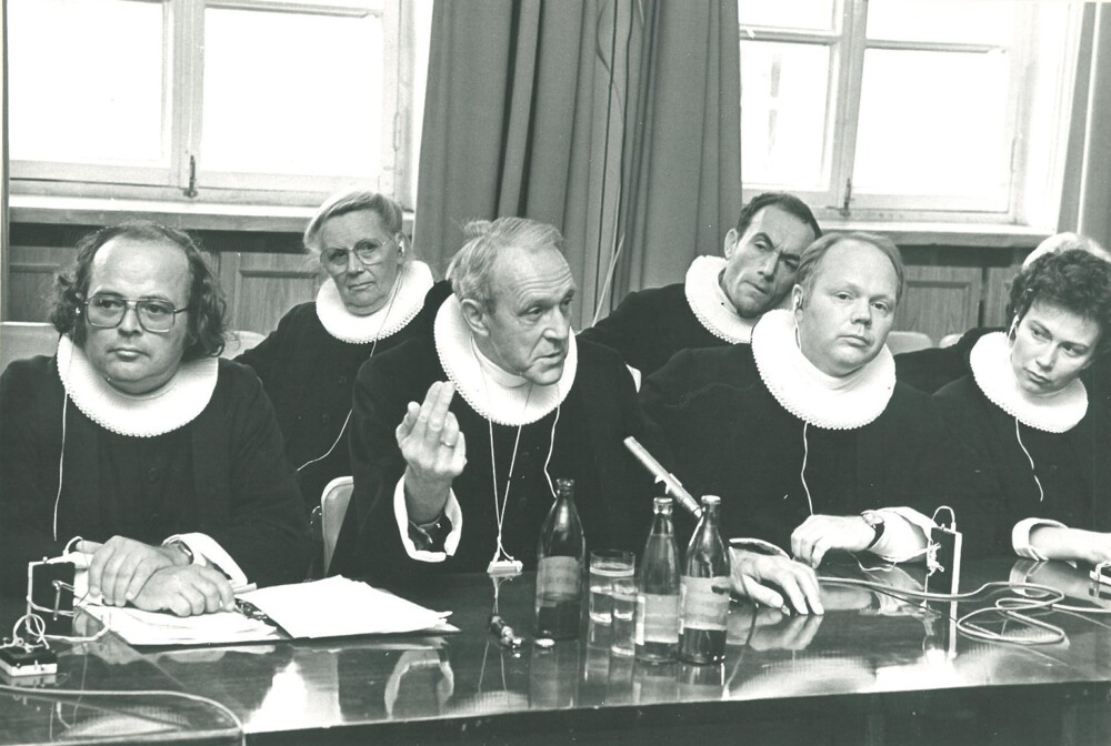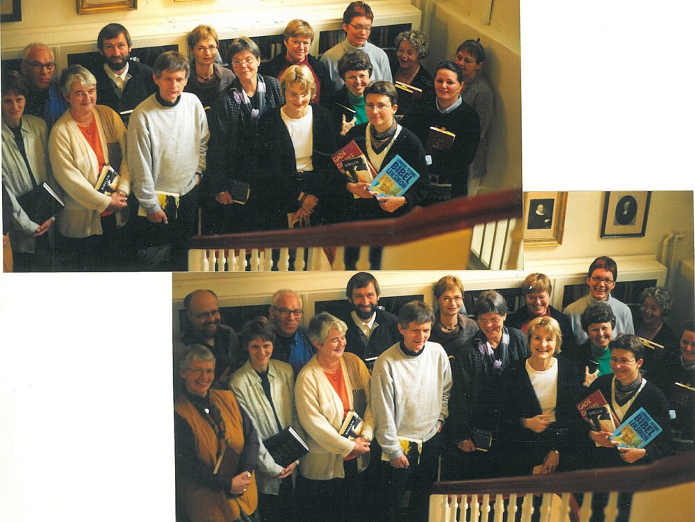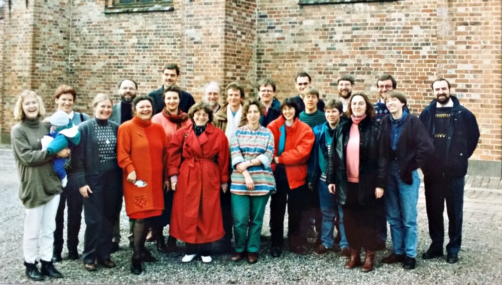 Historiens vingesus mærkes i høj grad på dette billede fra Maribo Domkirke i 1992, hvor deltagere ved det første efteruddannelseskursus for præster lod sig forevige.
