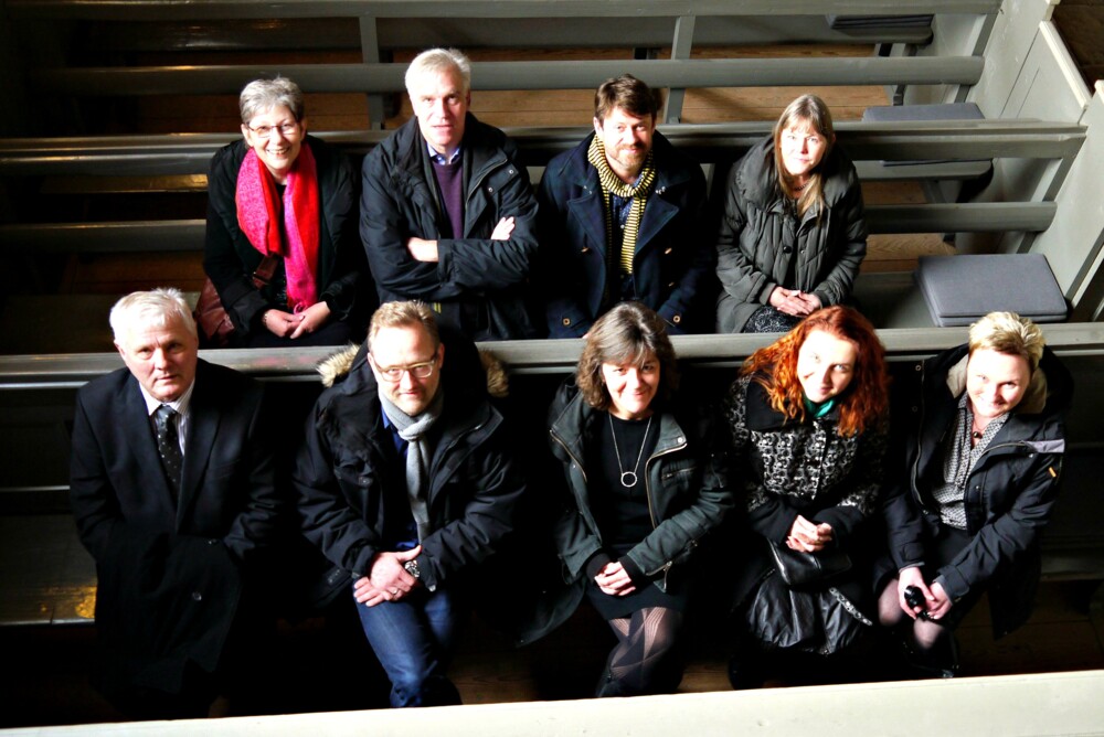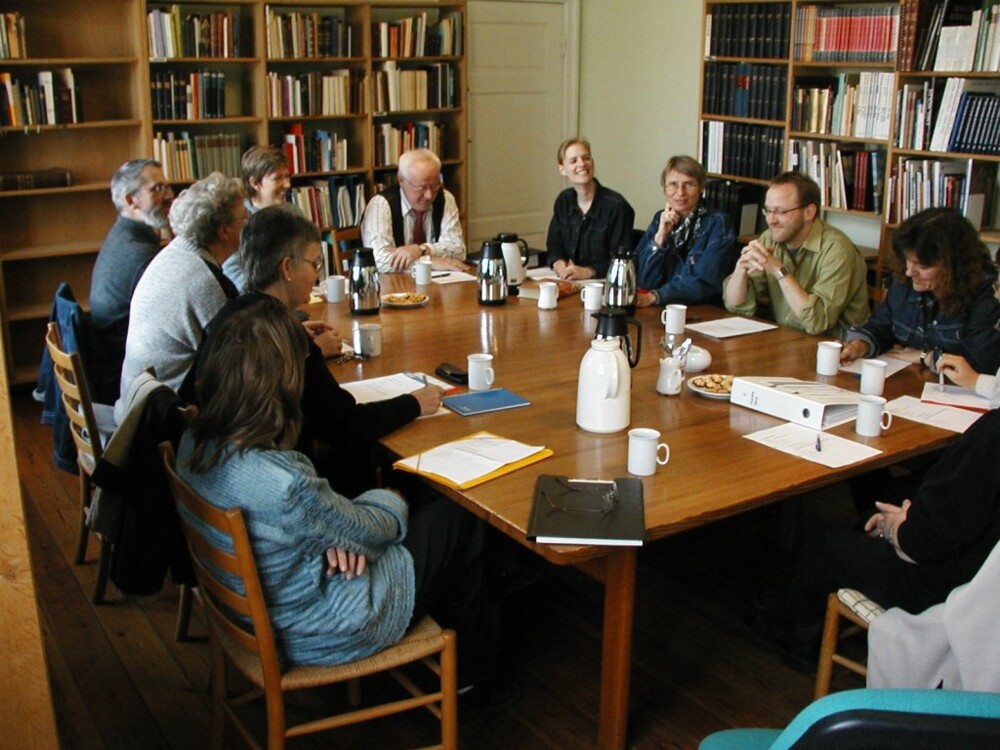 Medarbejdermøde på Slottet i Løgumkloster, april 2002. Der er kaffe og småkager på bordet. Scenen er sat til Hans Vium Mikkelsens første arbejdsdag som lektor i almen teologi på Teologisk Pædagogisk Center. Fra venstre og bordet rundt: Tina Larsen, Bente Kirchheiner, Asta Nørby, Finn Rosenberg, Helle D. Kjeldsen, Eberhard Harbsmeier, Marie K. Monrad, Marianne Bach, Hans Vium Mikkelsen og Helle Sangild Qvist.